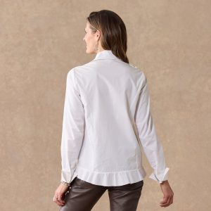 An enduring classic with fresh. au courant touches. this Victorian-inspired. button-up blouse features asymmetric cuffs. structured collar. unfinished hem. and a lovely trail of mixed media floral applique at the front. Cotton. Dry clean. Imported. Exclusive. Sizes XS (0–2). S (4–6). M (8–10). L (12–14). XL (16–18). XXL (20–22). Approx. 27.75l.