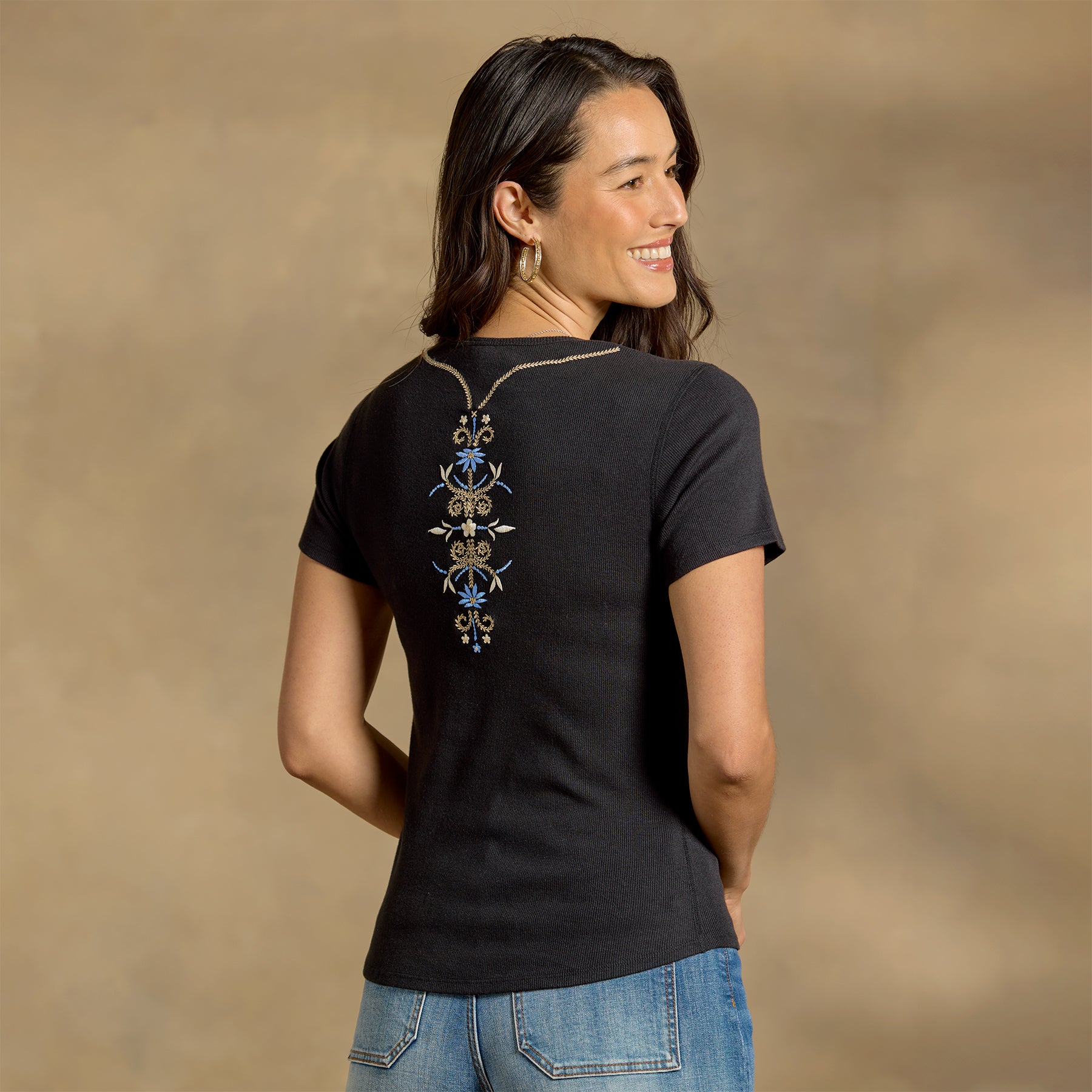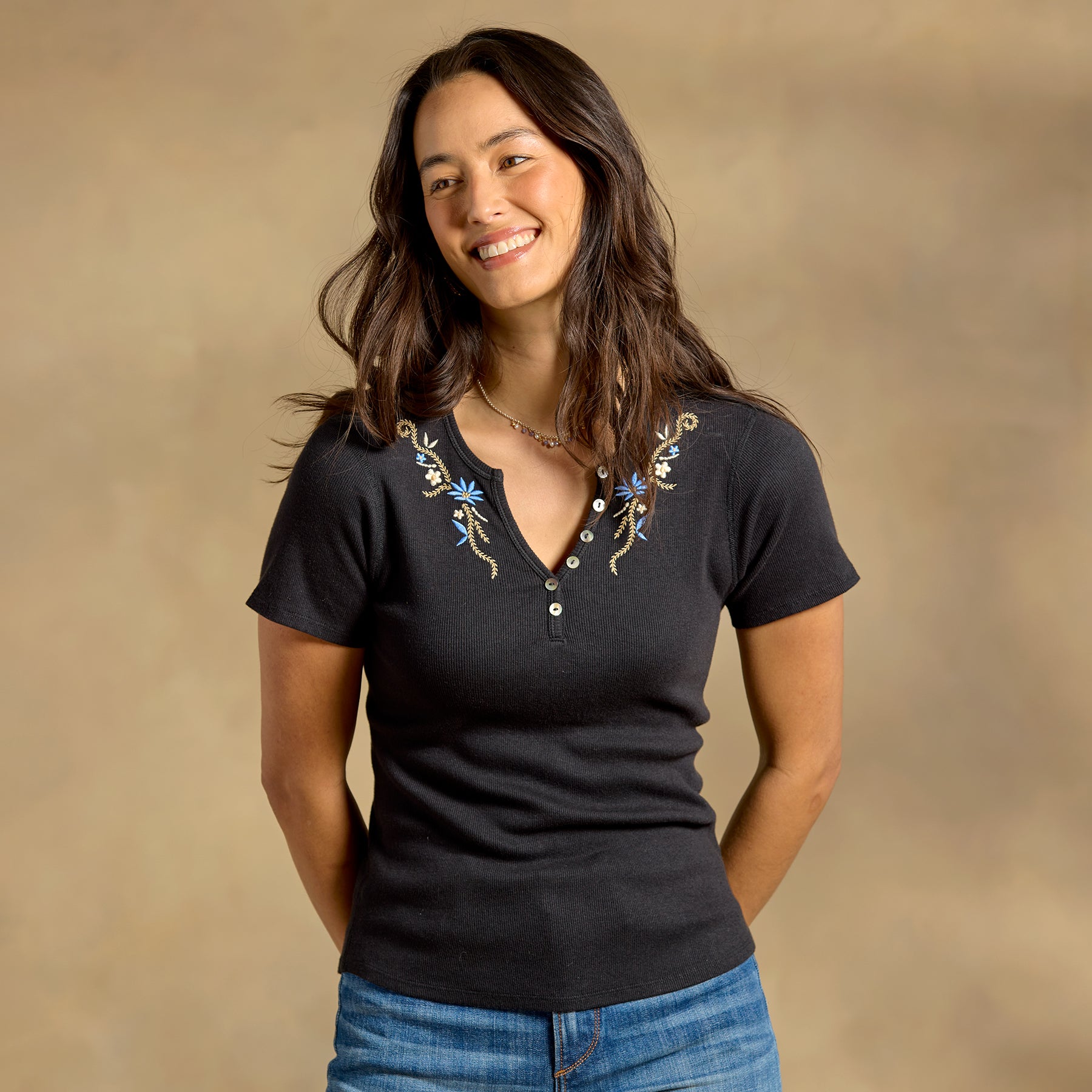 Nordic-inspired beauty graces this henley abloom with embroidered dahlias and unique Embroidered side seams. Choose one size up for best fit. Organic cotton/modal/spandex. Machine wash. Imported. Sundance exclusive. Sizes XS (0–2). S (4–6). M (8–10). L (12–14). XL (16–18). XXL (20–22). Approx. 24.5l.