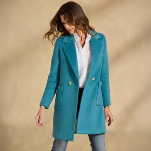 Stylish and bold. our stunning double breasted topper in menswear inspired pinstripes boasts two patch pockets and a contrast print lining. Polyester/wool. Dry clean. Imported. Exclusive. Sizes XXS (00). XS (0–2). S (4–6). M (8–10). L (12–14). XL (16–18). Approx. 34l.