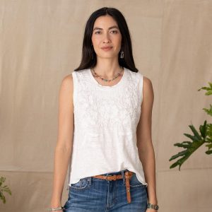 A true statement piece. our breezy linen tank embellished with tonal embroidery. French knot and raw-edge details. scalloped hem and embroidered side panels. Hand wash. Imported. Exclusive. Sizes XXS (00). XS (0 to 2). S (4 to 6). M (8 to 10). L (12 to 14). XL (16 to 18). Approx. 22L.