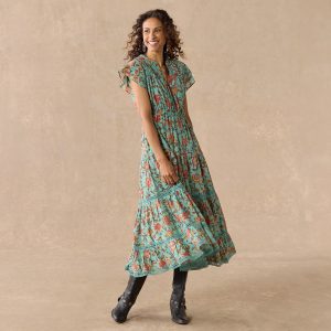 Feminine and flowing. a palette of gorgeous florals with contrast border print details. pintucking. elastic waist. double flutter sleeves and tiered hem. Fully lined. Cotton/silk. Hand wash. Imported. Exclusive. Sizes XXS (00). XS (0–2). S (4–6). M (8–10). L (12–14). XL (16–18). Approx. 49.5l.