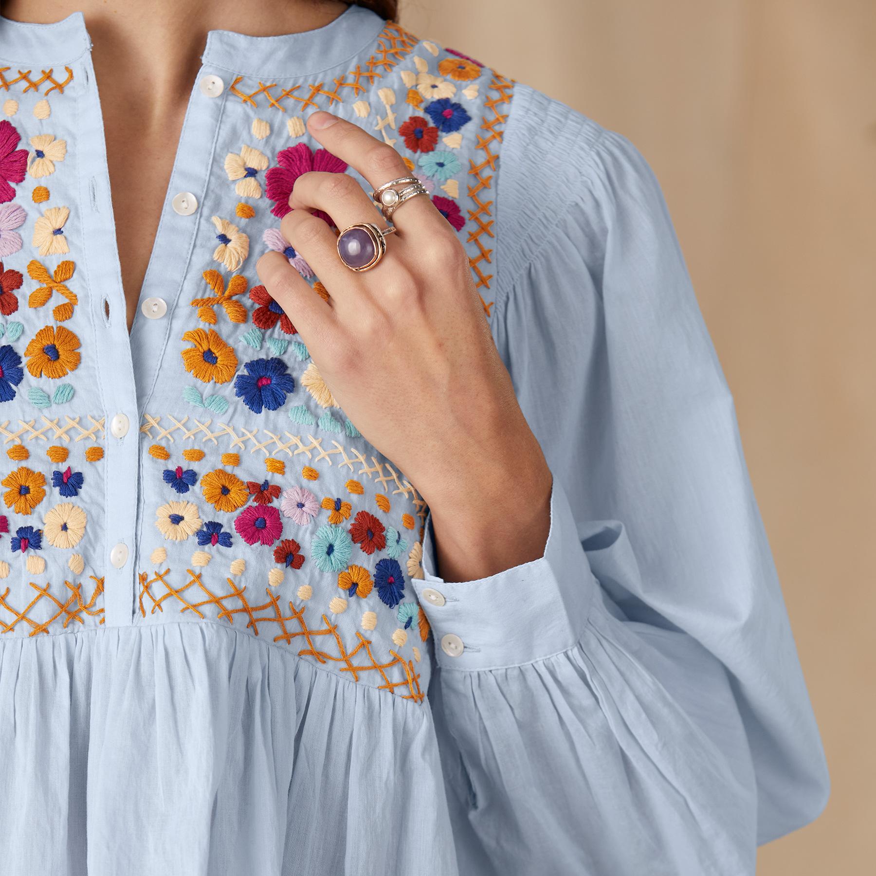 Handcrafted and embroidered with cotton yarns; features a gathered yoke and button placket. Cotton voile. Hand wash. Imported. XS to L. Approx. 24-3/4L.