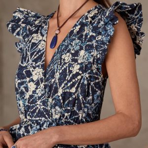 This distinctive party dress features a beautiful print. a V-neck in front and back. ruffled sleeves and asymmetric ruffled tiers. Full maxi length. Cotton. Machine wash. Imported. Sizes 2 to 16. Approx. 55-1/2L.