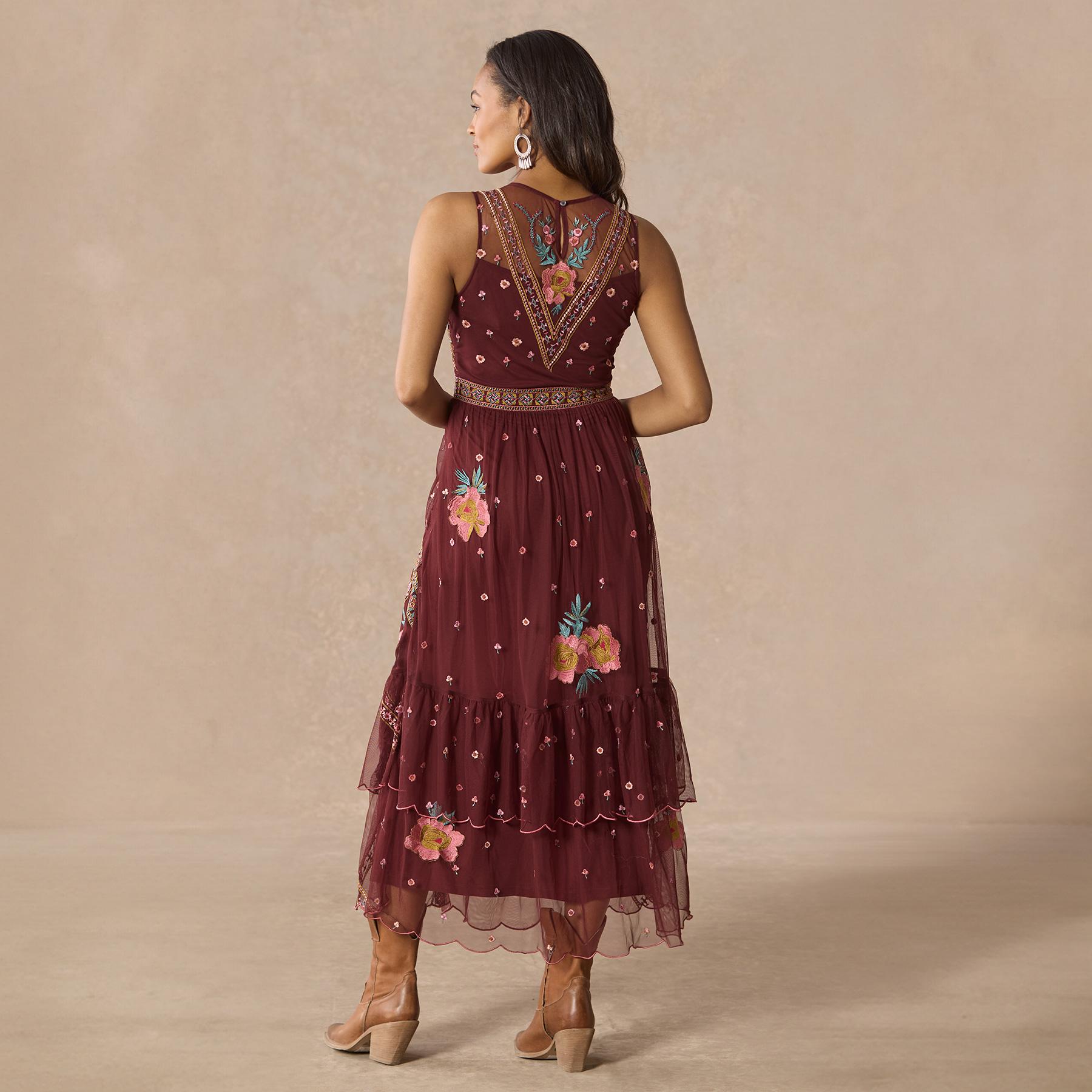 Our lovely fit and flare embroidered mesh dress features pretty florals mixed with geometric embroidery and a beautiful jewel neckline. Side zipper for an easy fit. Nylon. Hand wash. Imported. Exclusive. Sizes XS (0?C2). S (4?C6). M (8?C10). L (12?C14). XL (16?C18). XXL (20?C22). Approx. 54l.