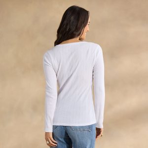 Our must have long sleeve crewneck top in a beautiful pointelle fabric will soon become a staple in your wardrobe. Scalloped stitching detail at the neckline. contrast bar tack. Cotton. Machine wash. Imported. Exclusive. Sizes XS (0–2). S (4–6). M (8–10). L (12–14). XL (16–18). XXL (20–22). Approx. 25l.