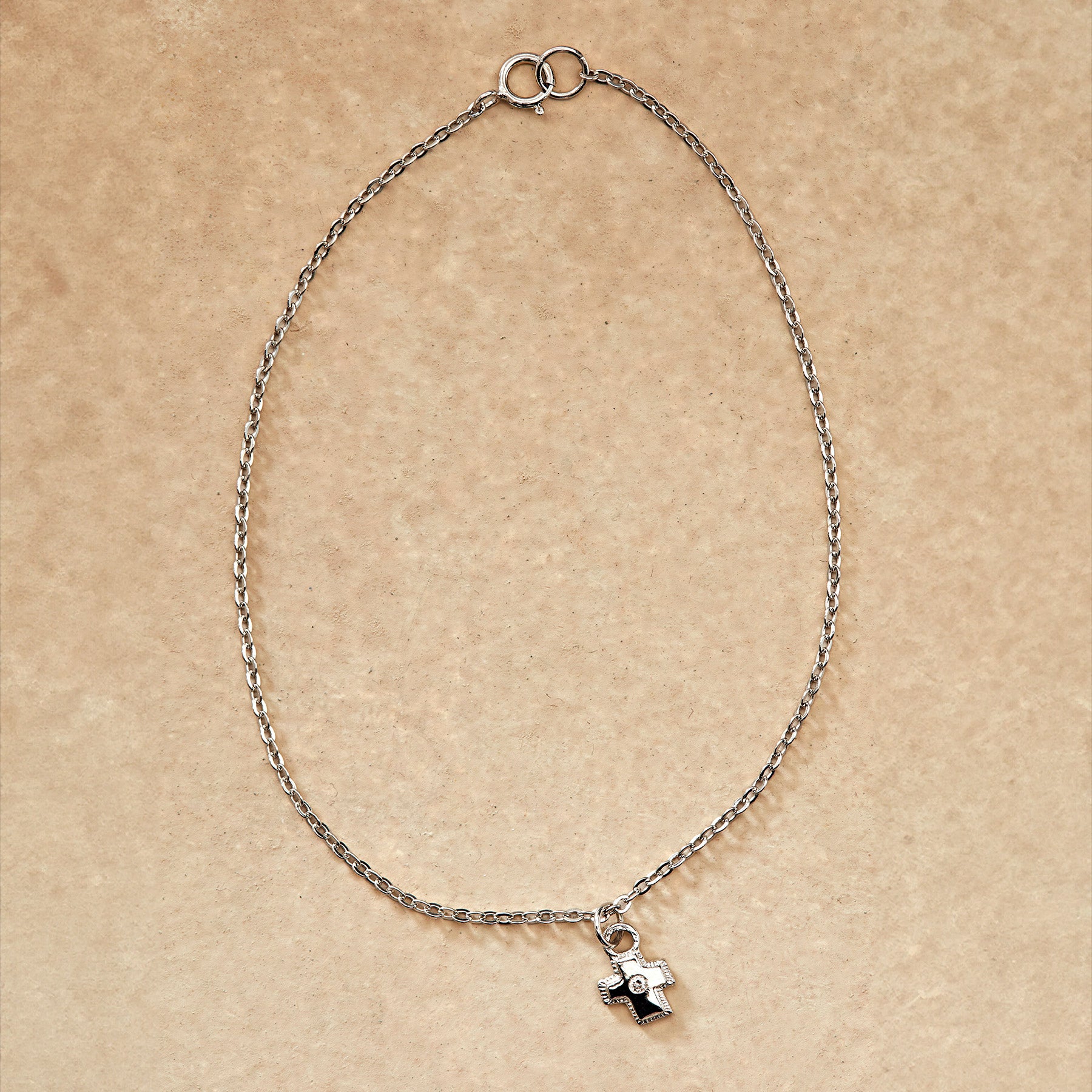 A single diamond gleams from a petite sterling silver cross in an enduring expression of faith. Sterling silver chain and spring ring clasp. Handcrafted in USA. 7-1/2l.